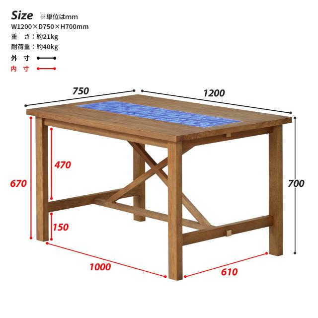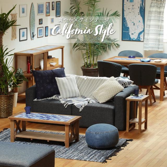 ダイニング リビング テーブル 西海岸風 カリフォルニアスタイル レトロ セラミックタイル タイル クロスバー マリン 爽やか ウッド リゾート 天然木 ラッカー塗装 木目調 120幅