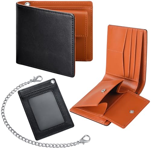 チェーン付き 財布 メンズ 2つ折り 大容量 財布 薄型 取り外しパスケース付き コンパクト 本革 カードケース 定期入れ カード 黒+オレ