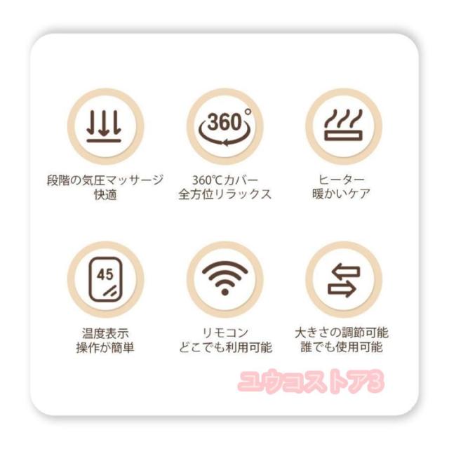 お好みに合わせて手動か自動のマッサージモードを選択できます。3段階調節強度,温感加熱も三つのランクで40℃(低)、45℃(中)、50℃(高)です.個人の快適さによって調節します。また、エアー加圧方式によって、三つのモード強?中?弱があり、お好みの最適な加圧モードでマッサージ可能です。