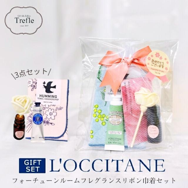 女性に人気のロクシタンのミニハンドクリーム(10ml)と、タオルハンカチ、フォーチューン(風水占い)ルームフレグランスをオーガンジー巾着に入れたギフトセットです。