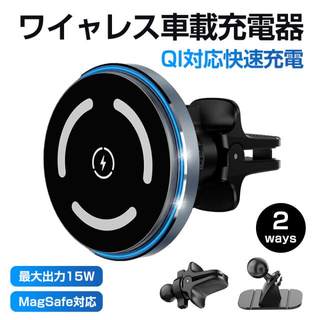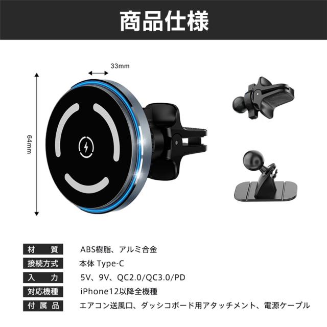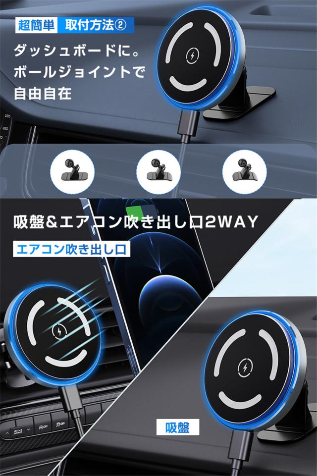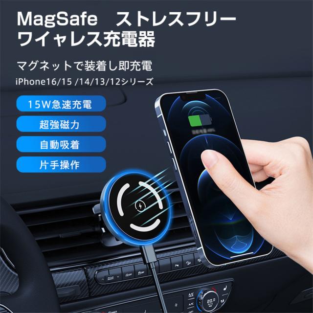 magsafe 車載 ワイヤレス充電器 車載ホルダー 最大15W出力 急速充電 360度回転 磁気吸着 スマホホルダー 吸盤 吹き
