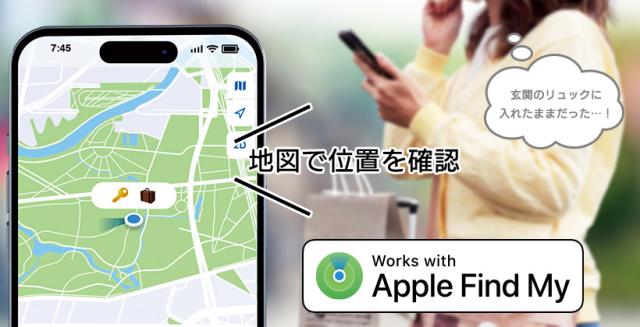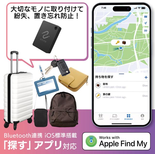 iPhoneの「探す」アプリから荷物のありかを探せるタグ型の紛失防止タグです。専用アプリ・ソフトのダウンロードは不要。鍵、財布、旅行バッグ、パソコンケースなど、失くしたくないものに付属させておくと、置き忘れや紛失した際、探しやすくなります。BluetoothでiPhone/iPadと連携し、標準搭載されている「探す」アプリに登録するとタグの位置が地図上に表示され、位置情報を特定することができます。
