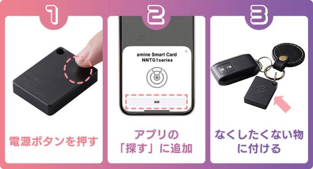 電源ボタンを押す > iPhone・iPadの『探す』アプリに登録 > 大切な荷物に付ける の3ステップのかんたん設定!位置情報はアプリからいつでも調べることができます。