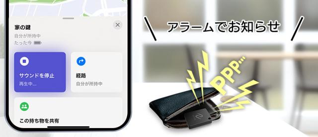 iPhoneのアプリで「サウンド再生」をタップすると紛失防止タグからサウンドが再生されます。室内などで置き場所を確認したり、バッグの中で紛れてしまった貴重品を探すのに役立ちます。