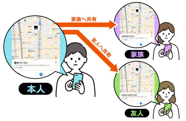 自分が登録した持ち物の位置を家族や友人に共有し、それぞれが個人スマホの「探す」アプリで探し出すことができます。例えば皆で使うものなどは、貸した相手が探せるように事前に共有しておくと便利です。