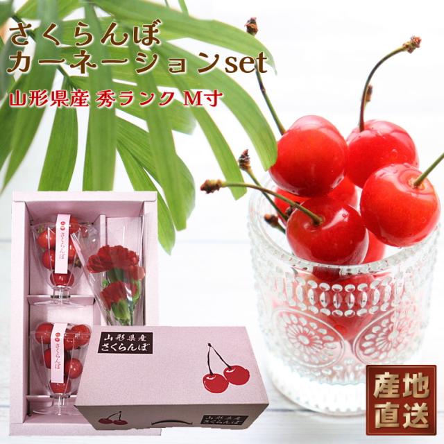 【早割中!】産直 産地直送 母の日 山形県産 さくらんぼ 佐藤錦 と カーネーション 佐藤錦 秀ランク M寸 母の日ギフト プレゼント ギフト 送料無料 プレゼント 用ギフトボックス入り フルーツギフト 果物 [(40gグラス×2)生花]【WI】