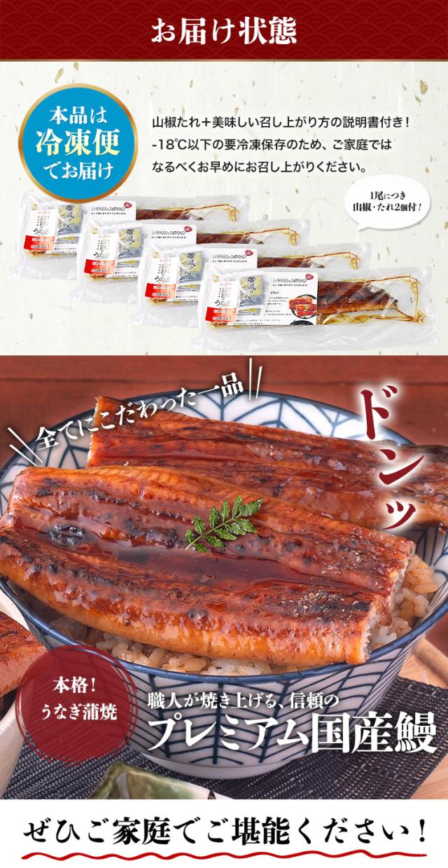 うなぎ(鹿児島県)、しょうゆ(大豆・小麦を含む)、砂糖、みりん、水あめ、発酵調味料