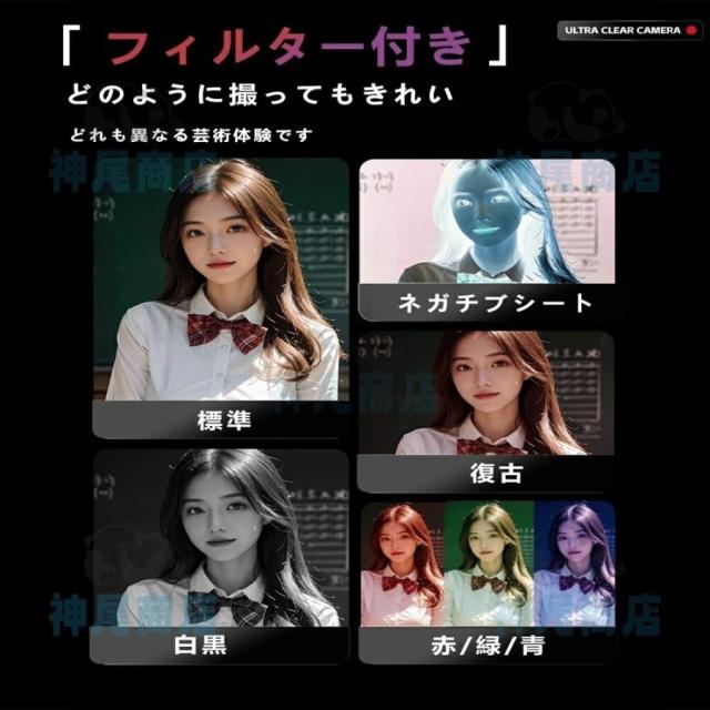 手ぶれ補正、ウェブカメラ、連続撮影、ビューティファンクション、ホワイトバランス、自動オフ、日付/時間表示などが設定でき、豊富な機能が持っています。また、多くの写真フィルタを搭載して、想像力と創造力を十分に発揮できます。</p>