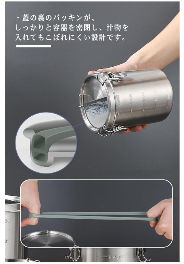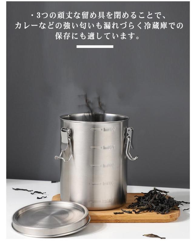 | ・しっかり密閉して鮮度を保つ ・蓋の裏のパッキンが、しっかりと容器を密閉し、汁物を入れてもこぼれにくい設計です。 ・茶葉やコーヒー豆、スパイスなど中に入れた食品を紫外線や湿気から守り鮮度を保ちます。 ・3つの頑丈な留め具を閉めることで、カレーなどの強い匂いも漏れづらく冷蔵庫での保存にも適しています。 ・コンロサイドや水周りでも安心して使えるステンレス製です。 | |
