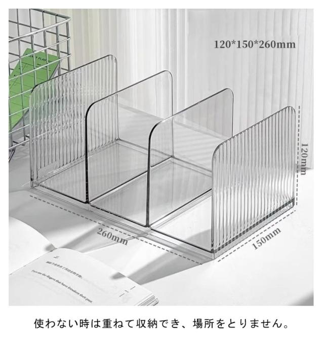 | いろんな本を立てかけることができるブックスタンドです。 高透明度のプラスチック素材を使用しており、中身を簡単に確認できるため、収納物の取り出しがスムーズ。 デスク周りの小物や書類整理に!小物をまとめて収納し、スッキリ整頓! 使わない時は重ねて収納でき、場所をとりません。 仕切り付きなので、書類の分類整理保存にとっても便利!探す時にも困りません。 コンパクトでもたっぷり収納!オフィスや自宅での作業効率を上げる収納ラック。 | |