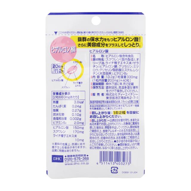 DHC ディーエイチシー ヒアルロン酸 20日分 40粒 栄養補助食品 サプリメント 健康食品 ヒアルロン酸含有食品 ビタミンB2 スクワレン[ギフトラッピング対応]