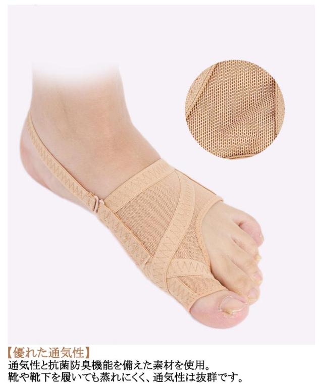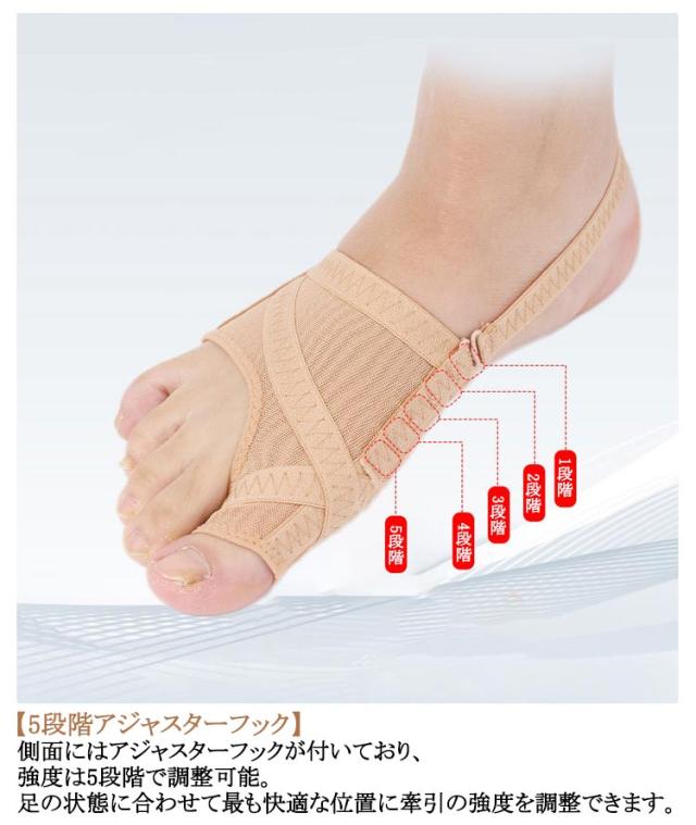 | 着替え便利な2足組! 【指が開く原理を応用】母趾・小趾サポーター は足の甲には弾力ゴムベルト二枚で加圧し、中足関節を閉めると指が開く原理を応用し、母趾と小趾を同時にサポートします。 【5段階アジャスターフック】側面にはアジャスターフックが付いており、強度は5段階で調整可能。足の状態に合わせて最も快適な位置に牽引の強度を調整できます。 【かかとベルトでズレ防止】かかとベルトがついているため、牽引の強度だけでなく、使用時のズレも防ぎます。 【優れた通気性】通気性と抗菌防臭機能を備えた素材を使用。靴や靴下を履いても蒸れにくく、通気性は抜群です。 【薄型で気軽なケア】薄型なのでそのまま靴を履くことができ、毎日気軽に足のケアができます。 | |