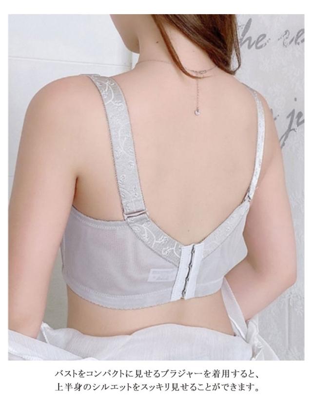 | バストを抑え込み高さを抑えてボリュームバストをすっきり小さく見せるブラです。 バストのボリュームを抑えて着痩せ効果有り。 前中心がレースメッシュの設計でバスト全体を包んでコンパクトに整えます。 脇高&幅広設計で背中から脇にかけてのハミ肉をしっかり支え、サイドのラインをすっきりととのえる。 肩にくい込みにくい幅広ストラップは、肌側がポコポコしているからズレにくく快適です。 ノンワイヤーでもバストをしっかり覆ってしっかり支えます バストをコンパクトに見せるブラジャーを着用すると、上半身のシルエットをスッキリ見せることができます。 大きいサイズでお悩みの方、春夏の薄着の季節に少しでも着痩せしたい!という方におすすめです。 | |