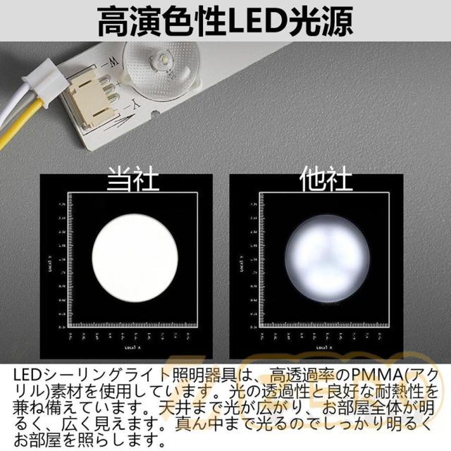 【調光調色タイプ】シーリングライトには、調光調色機能があります。明るさや色温度を調整できるため、部屋の雰囲気を変えることができます。例えば、電球のような暖かみのある光から、明るくクリアな光に変えることができます。また、明るさを調整することで、部屋全体を均等に照らすだけでなく、間接照明としても使えます。