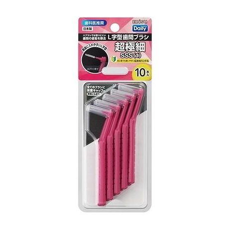 ハブラシでは取りにくい歯間の歯垢を除去。お手入れしにくい奥歯の歯間に入れやすいL字型歯間ブラシ。全てのブラシに保護キャップ付で衛生的かつ携帯に便利。初心者でも安定して持てる広めのハンドルで向きが定めやすく、狙いやすい。歯ぐきの退縮がほとんどなくすき間が見えない方におすすめの超極細(SSS)サイズ。10本入。日本製。歯科医推奨。