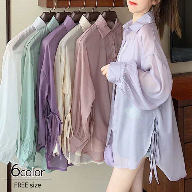 サイドリボン シアー シャツ 長袖 とろみ シースルー 透け感 オーバーサイズ シンプル 無地 ブラウス 長め丈 トップス レディース ■tl609■ 韓国ファッション オールシーズン お洒落 カジュアル かわいい かっこいい 無地
