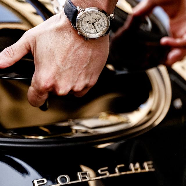 今回の限定モデルには、バンドと同じ加工を施したヴィンテージポルシェレザーを持ち手に使用したNEW ANTIQUE製のオリジナルバッグが付属します。