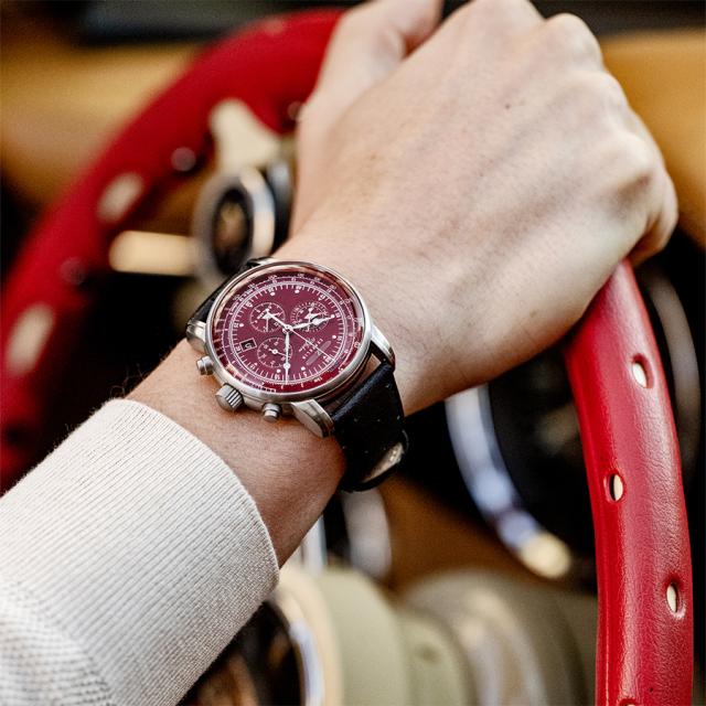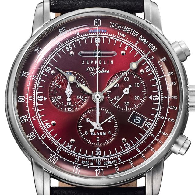 ベースモデルは、ツェッペリンで大人気となっている100周年記念シリーズのクロノグラフアラームです。湾曲したボンベダイヤルやドームガラス、飛行船型のケースが織りなす立体感は唯一無二のデザインです。
