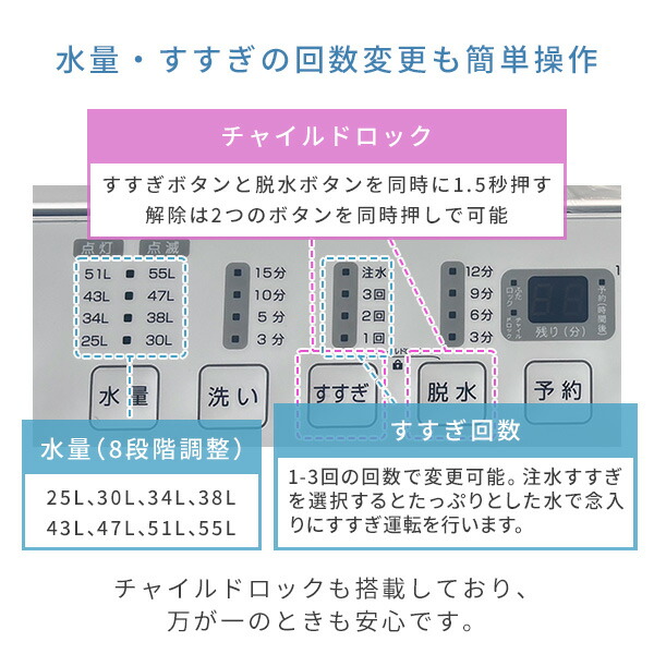 | 商品説明 | ●電源:AC100V(50/60Hz) ●洗濯時消費電力:410/470W(50/60Hz) ●標準使用水量:120L ●標準洗濯・脱水容量:7.0kg ●洗濯方式:うず巻式 ●水道水圧:0.03-0.85Mpa ●選べるコース:標準・毛布・おいそぎ・ドライ・ソフト・つけおき・部屋干し・槽洗浄 ●メーカー保証:1年間 |