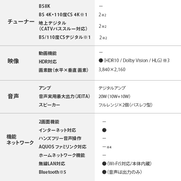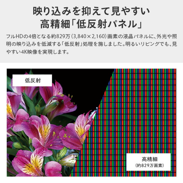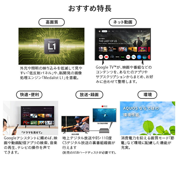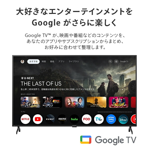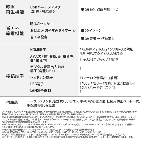 | 商品説明 | ●画面サイズ:55V型 ●画素数:3840×2160 ●消費電力:約139W ●待機時消費電力:0.5W ●年間消費電力量:108kWh/年 ●付属品:テーブルスタンド(組立式)、リモコン、単4形乾電池(2個)、転倒用防止ベルト一式、取扱説明書、保証書 ●OS:Google TV ●チューナー:BS 4K・110度CS 4K、地上デジタル(CATVパススルー対応)、BS/110度CSデジタル ●USB外付けハードディスク(別売)対応 ●HDR映像対応 ●メーカー保証1年付き |