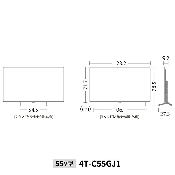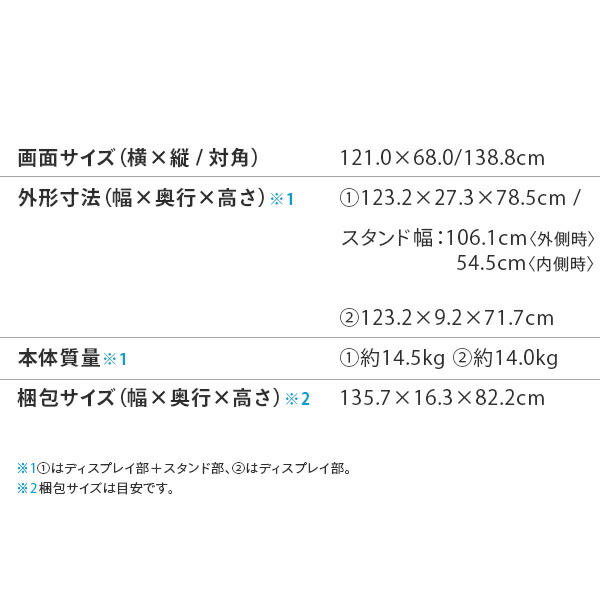 | 本体サイズ | 幅123.2×奥行9.2×高さ71.7cm 重量14kg スタンド幅:106.1cm(外側)/54.5cm(内側) スタンド取付時:幅123.2×奥行27.3×高さ78.5cm 重量14.5kg |