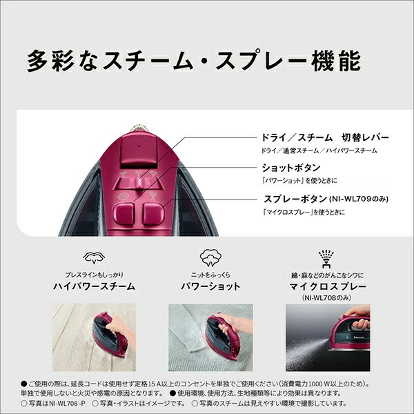 | 商品説明 | ●消費電力:1400W ●持続時間:最長約180秒 ●スチーム量:平均約9.5g/分 ●注水量:120ml ●ショット:ハイパワーショット、ハイパワースチーム ●スチーム噴出量切替:2段階(中・高温スチーム) ●スチーム穴数:32 ●コード長さ:140cm(コードリール) ●Wヘッドベースでどの方向に動かしてもシワがつきにくい ●水漏れストッパー:スチーム使用中の水もれを防止 |