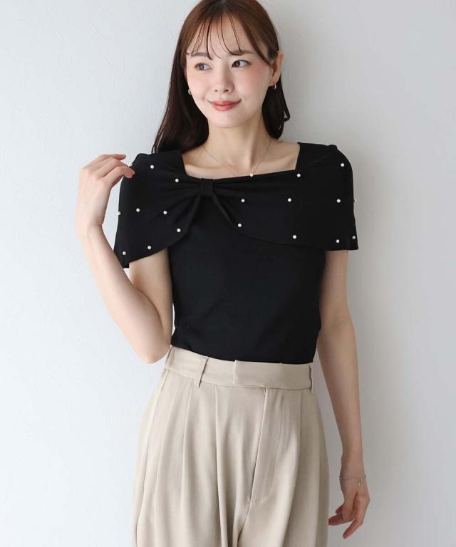 華やかさと女性らしさを兼ね備えた、パールリボン付きの半袖ニットトップス。