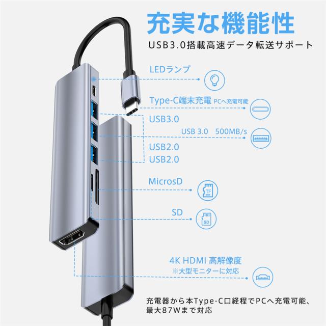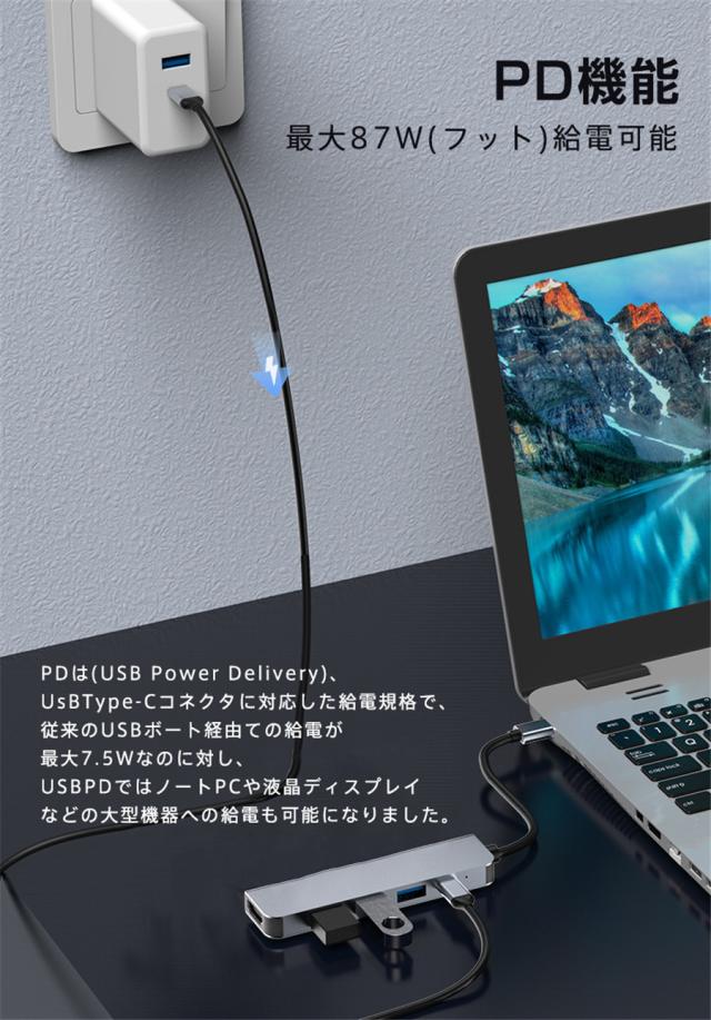 USBハブ type-c 高速 USB3.0 高速データ転送 PD 87W 急速充電 簡単接続 USB拡張 コンパクト Macbook/Windows/コンピューター対応 薄型 軽量 テレワーク