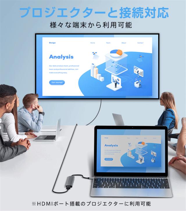HDMI出力端子が搭載されていないパソコンでもテレビや大型モニターに接続できて、