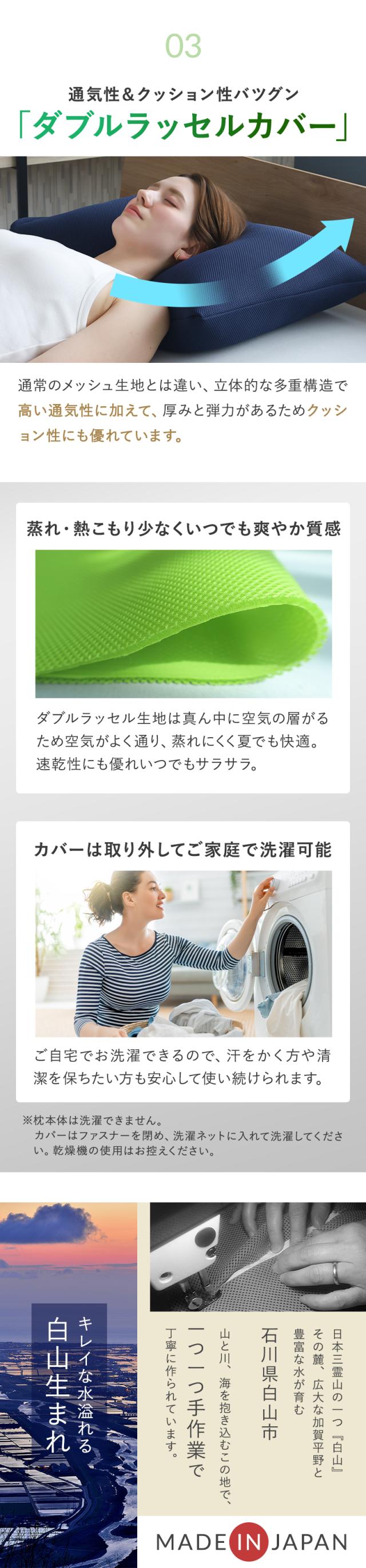 ■ふんわりやわらか低めの寝心地 やわらかな枕は違和感を感じずらく、睡眠を妨げません。高めでボリュームのある見た目に反し低めの寝心地で首にやさしく全身リラックスしてお休みいただけます。 ■様々な寝姿勢に対応 仰向けはもちろん、うつ伏せや横向きでも圧迫感なくお休みいただけます。その他、抱き枕やクッションとしてもご使用いただけ様々なシーンで活躍します。 ■軽くて持ち運びも楽 リビングでのお昼寝やワークスースでの背あてなど軽くて持ち運びも楽なので使いたい時、使いたい場所で手軽にご使用いただけます。 ■通気性の良いダブルラッセル生地 生地には通気性が高く、クッション性があるダブルラッセルを使用。熱がこもりにくく蒸れによる気持ち悪さも解消します。 ■安心安全の日本製、カバーは洗濯可能でいつでも清潔 石川県白山市で作られた安心安全の日本製。一つ一つ丁寧に作られています。カバーはご自宅で洗濯できるので、衛生的にも安心。いつでも清潔にお使いいただけます。 ■ギフトにもおすすめ ご家族やお世話になった方へ。誕生日や母の日、父の日などプレゼントにも最適です。 |