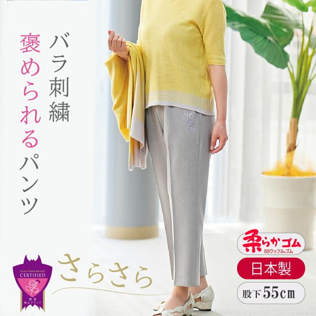福山ブランドにも認定されたバラ刺繍パンツ。上品で快適さを追求しております。ウエストは大好評の柔らかゴムを採用し締め付けのない優しい履き心地です。