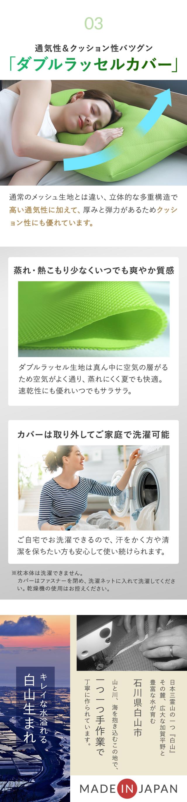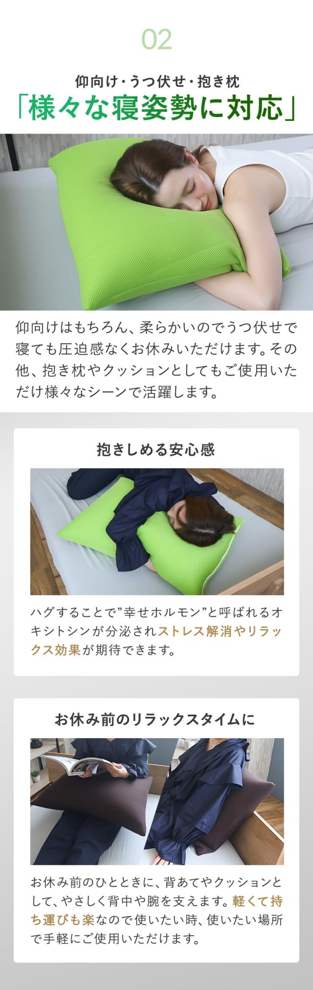 ■ふんわりやわらか低めの寝心地 やわらかな枕は違和感を感じずらく、睡眠を妨げません。高めでボリュームのある見た目に反し低めの寝心地で首にやさしく全身リラックスしてお休みいただけます。 ■様々な寝姿勢に対応 仰向けはもちろん、うつ伏せや横向きでも圧迫感なくお休みいただけます。その他、抱き枕やクッションとしてもご使用いただけ様々なシーンで活躍します。 ■軽くて持ち運びも楽 リビングでのお昼寝やワークスースでの背あてなど軽くて持ち運びも楽なので使いたい時、使いたい場所で手軽にご使用いただけます。 ■通気性の良いダブルラッセル生地 生地には通気性が高く、クッション性があるダブルラッセルを使用。熱がこもりにくく蒸れによる気持ち悪さも解消します。 ■安心安全の日本製、カバーは洗濯可能でいつでも清潔 石川県白山市で作られた安心安全の日本製。一つ一つ丁寧に作られています。カバーはご自宅で洗濯できるので、衛生的にも安心。いつでも清潔にお使いいただけます。 ■ギフトにもおすすめ ご家族やお世話になった方へ。誕生日や母の日、父の日などプレゼントにも最適です。 |