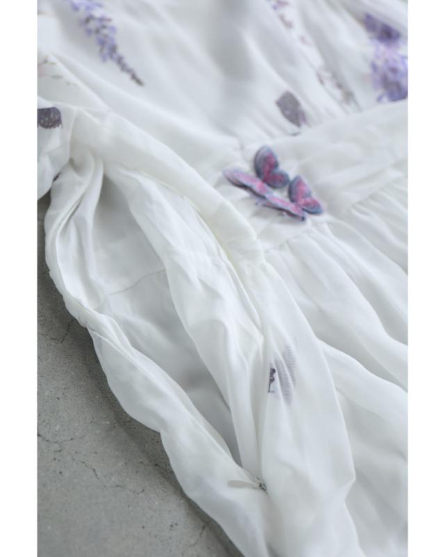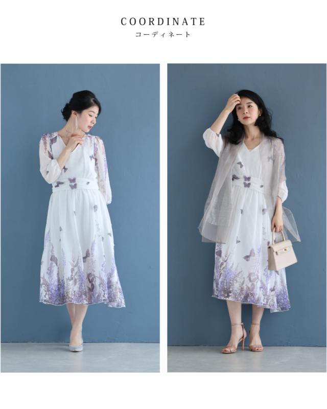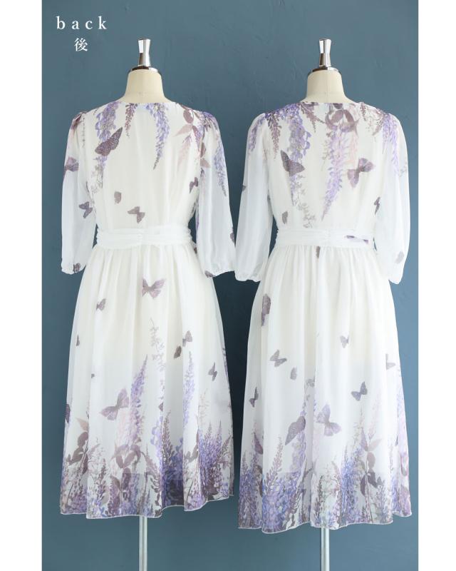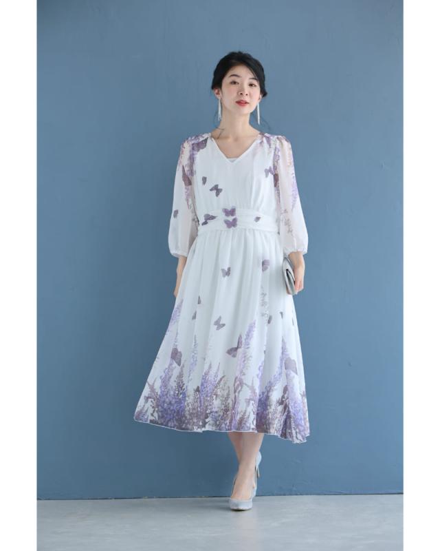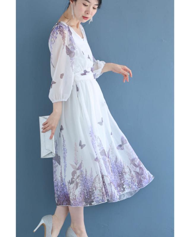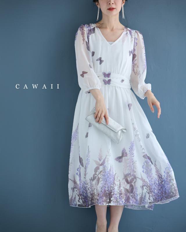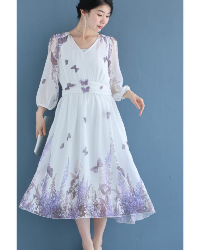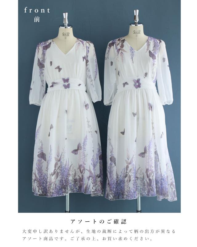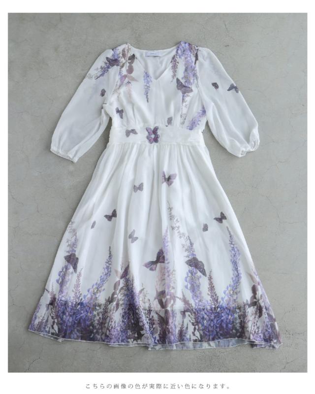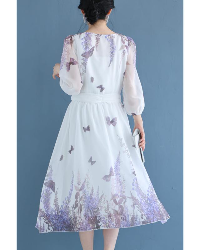 新作4月22日 花舞い蝶々のふんわりミディアムワンピース cawaii w61220ps S~M対応 ホワイト 半端袖7分袖 八分袖 Vネック 軽量 爽やか 清楚感 日常使い デート おでかけ 旅行 お呼ばれ 柄 プリント シフォン レディース ファッション 大人 ママ ミセス 30代 40代 50代
