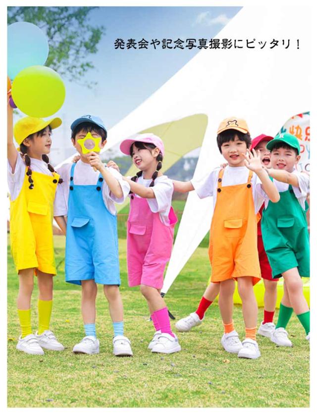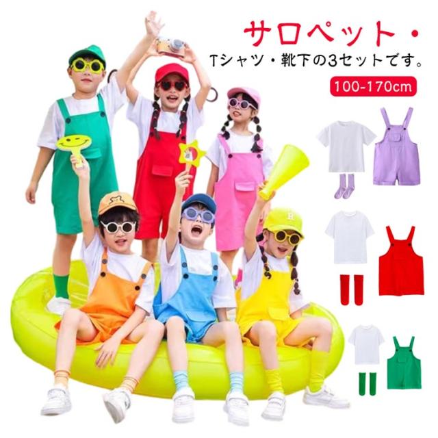 カラーパンツ カラフル 女の子 半袖Tシャツ+オーバーオール+靴下 子供服 演出服 サロペットパンツ ダンス衣装 ベビー服 男の子 3点セット 保育園 発表会 卒園式 キッズ 応援団 文化祭 学校 幼稚園 ダンスウエア 卒業式
