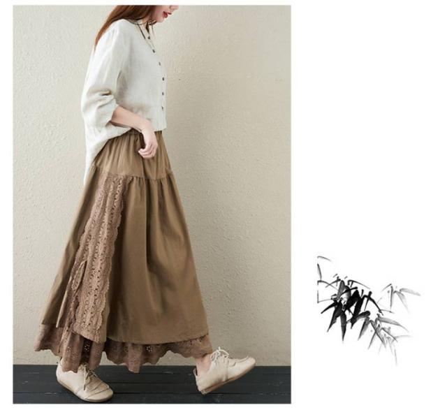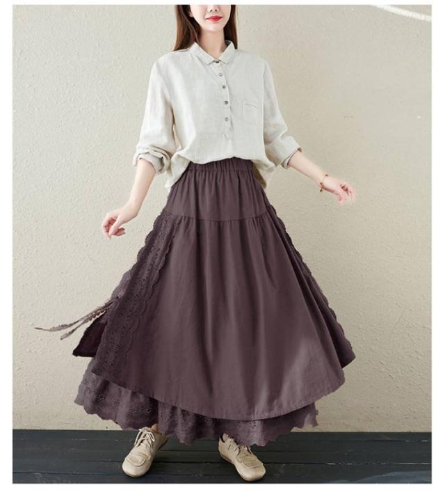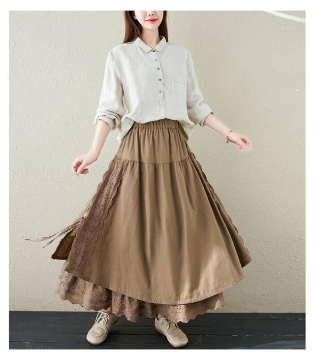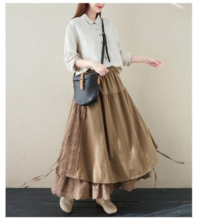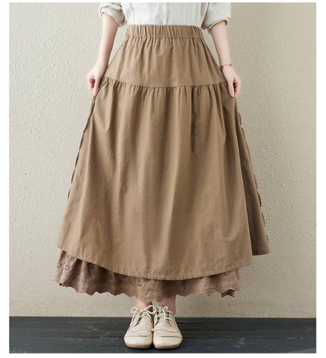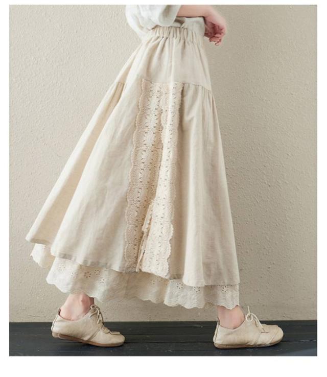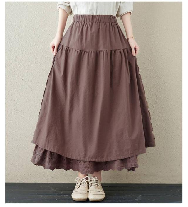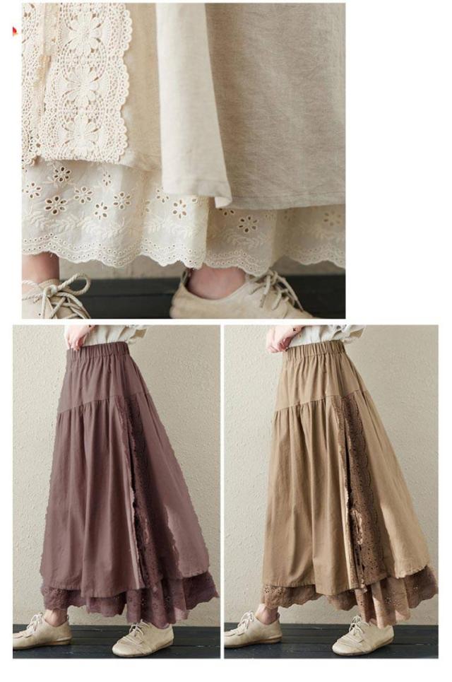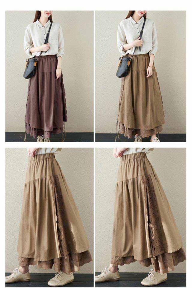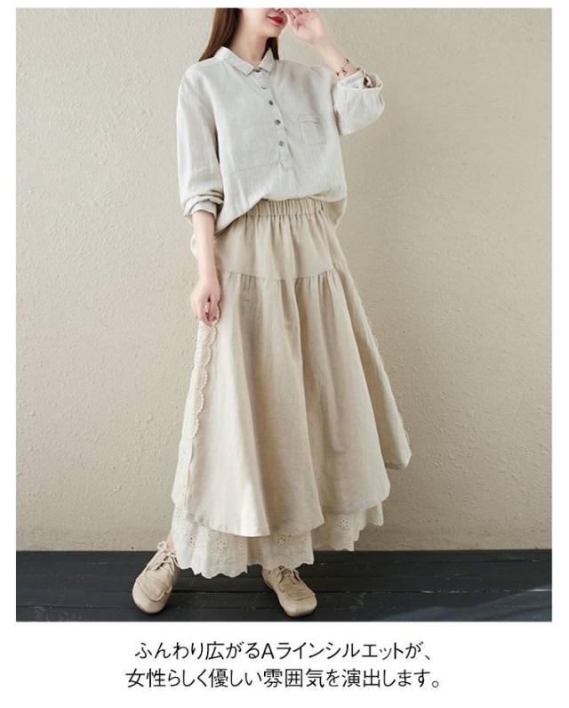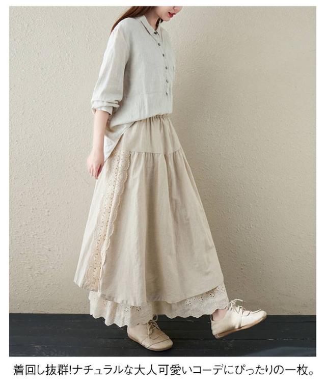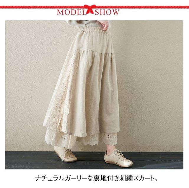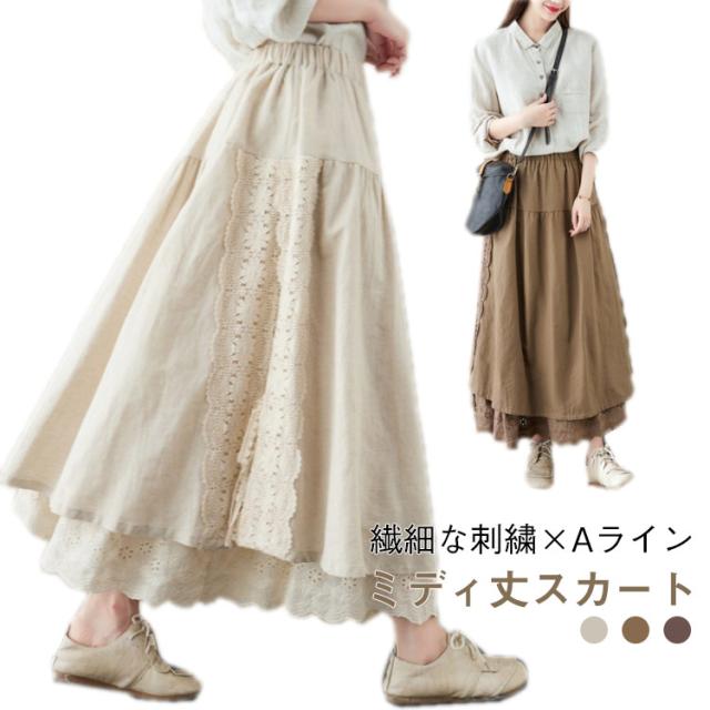 ミディアム丈 レース刺繍 スカート ロングスカート Aライン ナチュラル スカート 刺繍スカート ロング丈 かわいい 体型カバー 裏地付き 春夏 秋