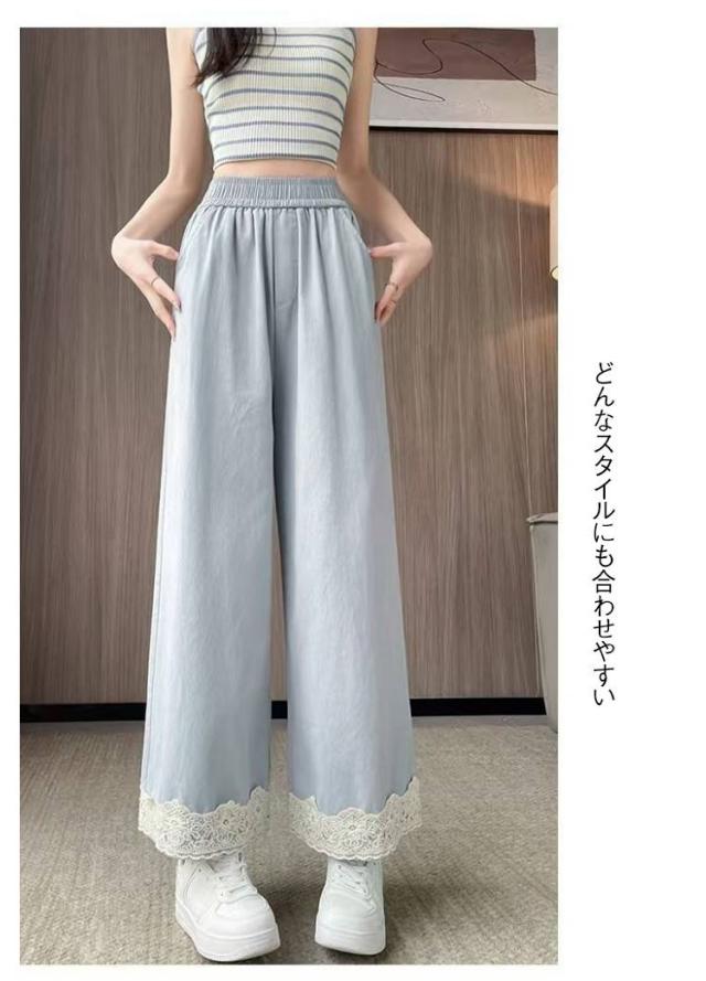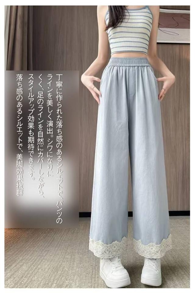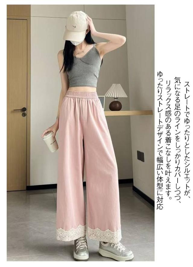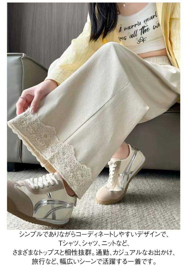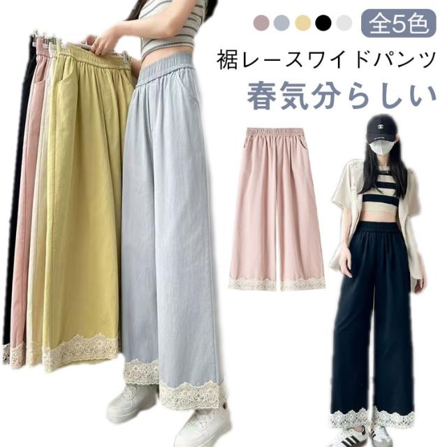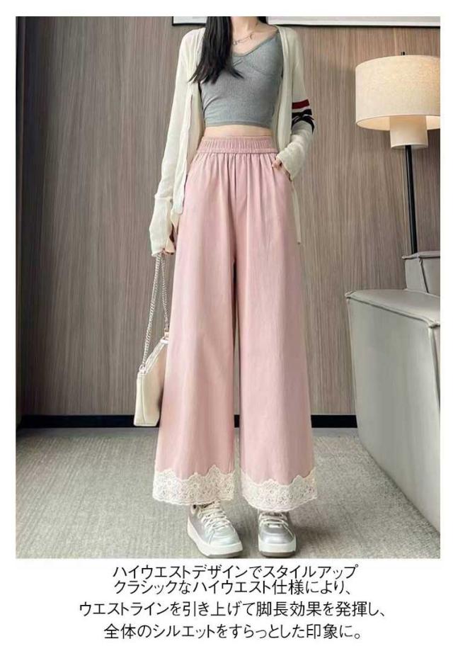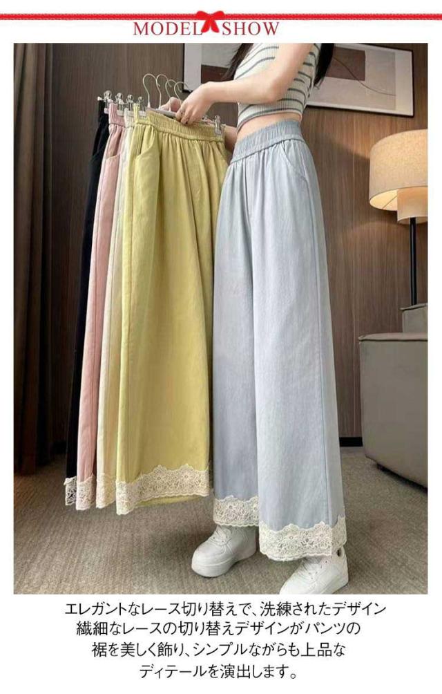 春用 レース切り替え カジュアル 高級感 ワイドパンツ ハイウエスト レディース ウエストゴム ストレートパンツ ゆったり カラーパンツ レース裾 おしゃれ 可愛い 春色 レース切り替え 楽チン ボトムス