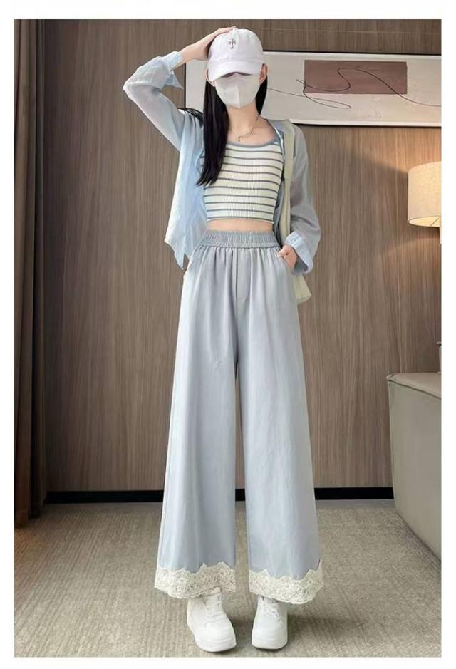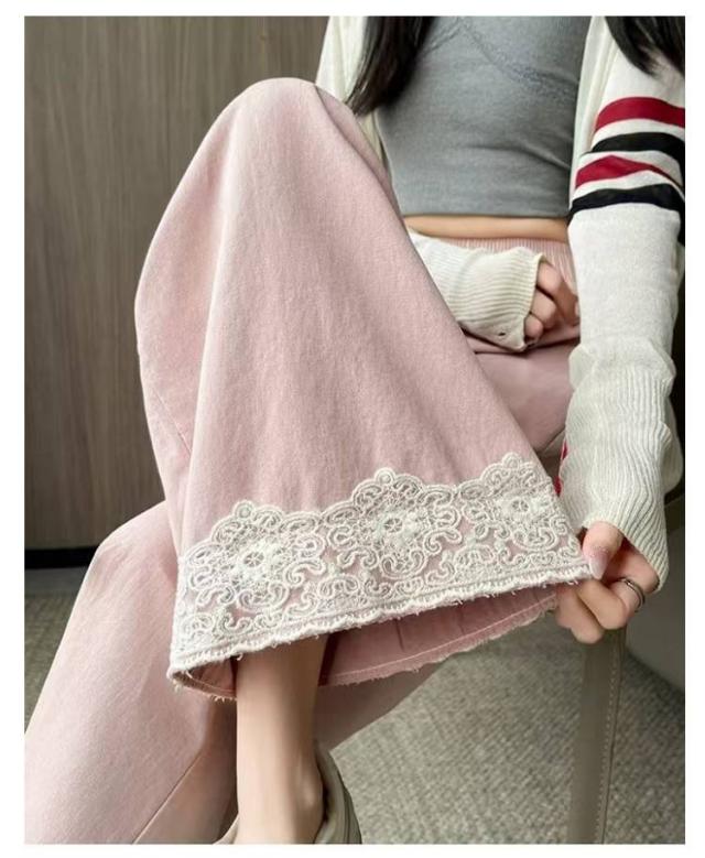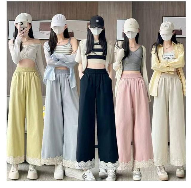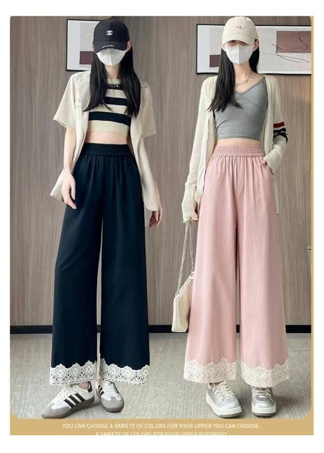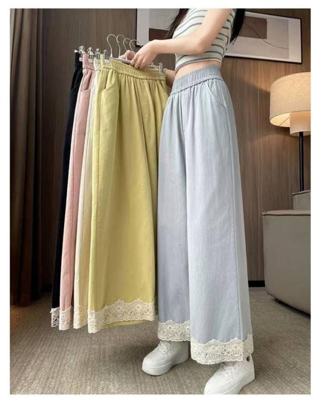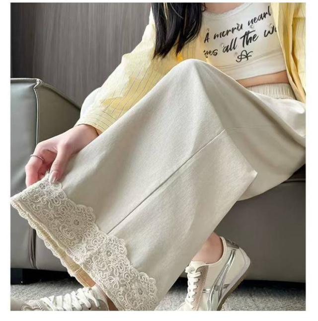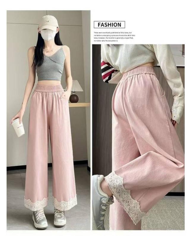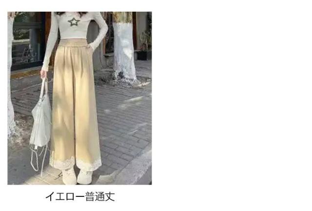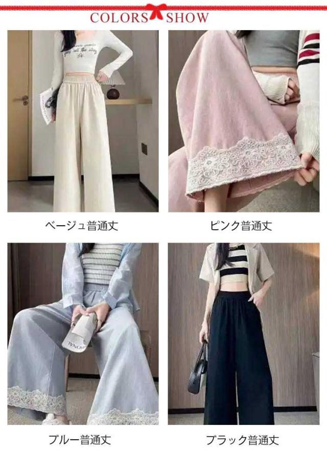 春用 レース切り替え カジュアル 高級感 ワイドパンツ ハイウエスト レディース ウエストゴム ストレートパンツ ゆったり カラーパンツ レース裾 おしゃれ 可愛い 春色 レース切り替え 楽チン ボトムス