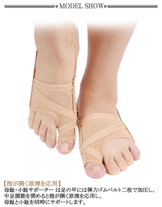 | 着替え便利な2足組! 【指が開く原理を応用】母趾・小趾サポーター は足の甲には弾力ゴムベルト二枚で加圧し、中足関節を閉めると指が開く原理を応用し、母趾と小趾を同時にサポートします。 【5段階アジャスターフック】側面にはアジャスターフックが付いており、強度は5段階で調整可能。足の状態に合わせて最も快適な位置に牽引の強度を調整できます。 【かかとベルトでズレ防止】かかとベルトがついているため、牽引の強度だけでなく、使用時のズレも防ぎます。 【優れた通気性】通気性と抗菌防臭機能を備えた素材を使用。靴や靴下を履いても蒸れにくく、通気性は抜群です。 【薄型で気軽なケア】薄型なのでそのまま靴を履くことができ、毎日気軽に足のケアができます。 | |