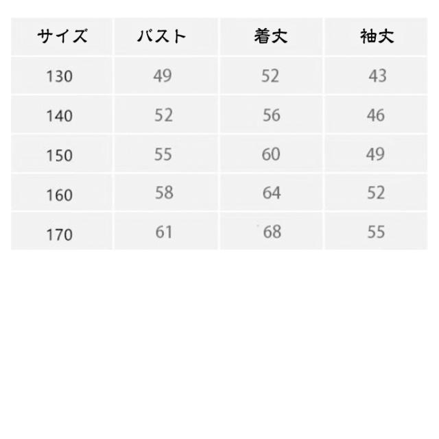 | サイズについての説明 | 【110】着丈48cm 袖丈39cm バスト43cm 【120】着丈51cm 袖丈40cm バスト46cm 【130】着丈52cm 袖丈43cm バスト49cm 【140】着丈56cm 袖丈46cm バスト52cm 【150】着丈60cm 袖丈49cm バスト55cm 【160】着丈64cm 袖丈52cm バスト58cm 【170】着丈64cm 袖丈55cm バスト61cm ※サイズは平置き実寸になります。 サイズ表の実寸法は商品によって1-3cm程度の誤差がある場合がございます。 |