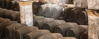 シェリーの熟成法を「ソレラ・システム」といいます。熟成庫には樽が3~4段に積み上げられています。瓶詰めは1番下の樽から取り出し、減った分をその1つ上の樽から補充します。発酵を終えたばかりのシェリーは1番上の樽に入れます。1番下の樽を「ソレラ」とよびます。少しずつ取り出され、少しずつ補充されるため、味は常に一定に保たれます。古いものとすこしずづ混ざり合いながら複雑に熟成されていきます。