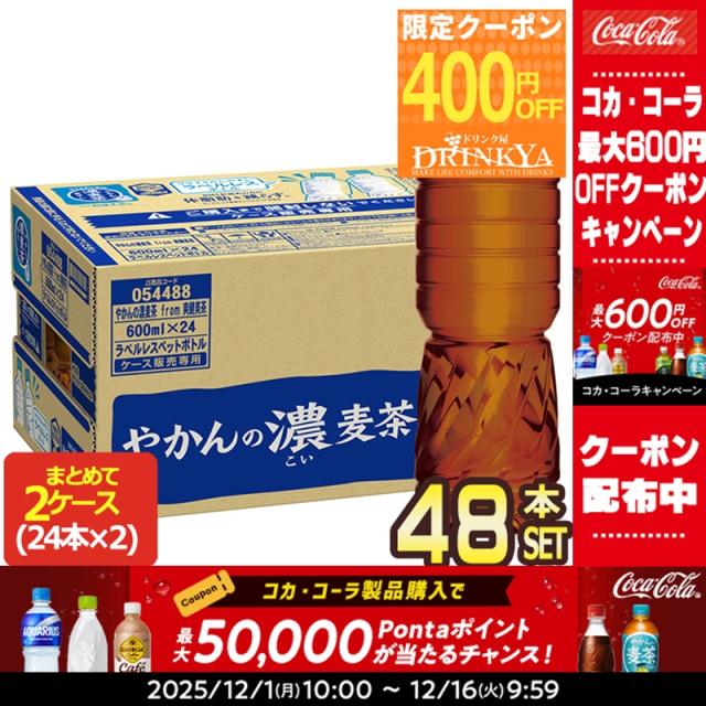 【最大1000円クーポン】コカコーラ やかんの濃麦茶 ラベルレス 600mlPET×48本[24本×2箱] 【2〜3営業日以内に出荷】[送料無料] お茶 ペットボトル 麦茶 機能性表示食品