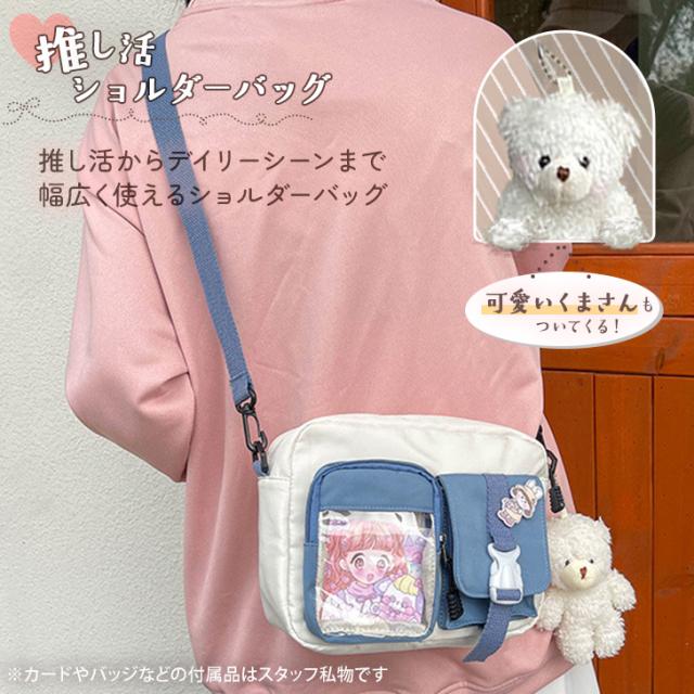 ■注意事項2:本製品の着用画像内にあるイラストカードやバッジ等は撮影スタッフの私物となり、付属いたしません。付属品はショルダーストラップとくまのチャームのみとなりますので、ご確認の上お買い求めください。