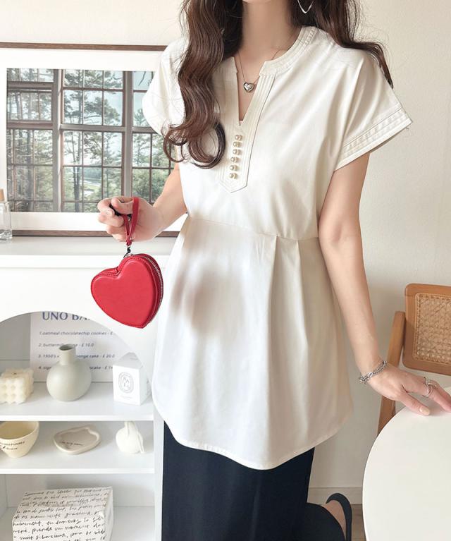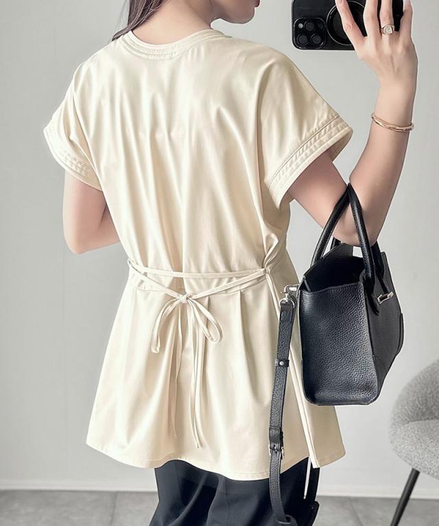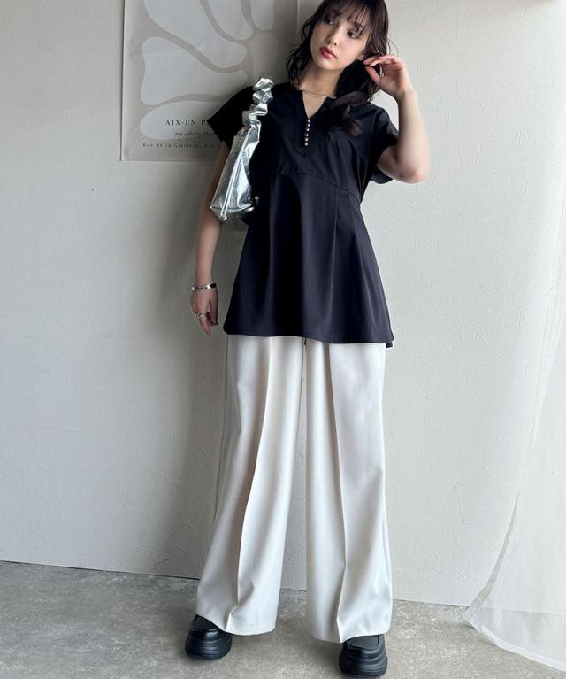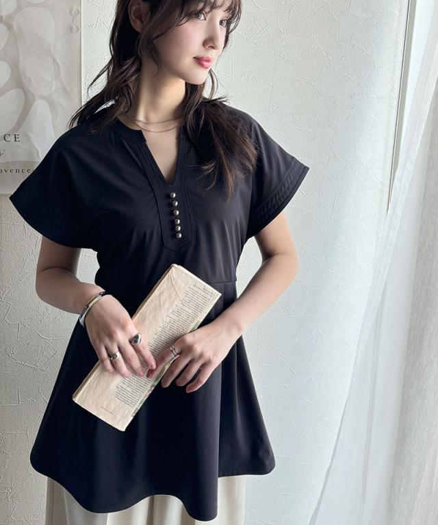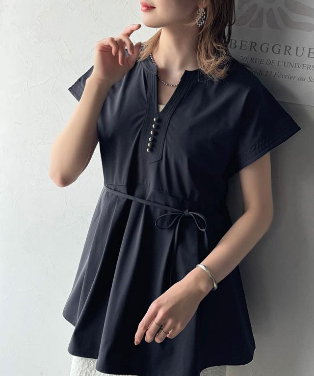 ★上品さを纏う。胸元パールボタン使いペプラム半袖カットソーブラウス(接触冷感・遮熱・UVカット)★