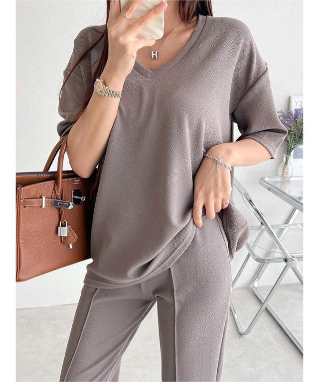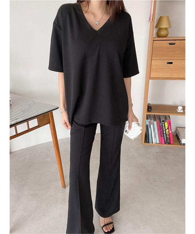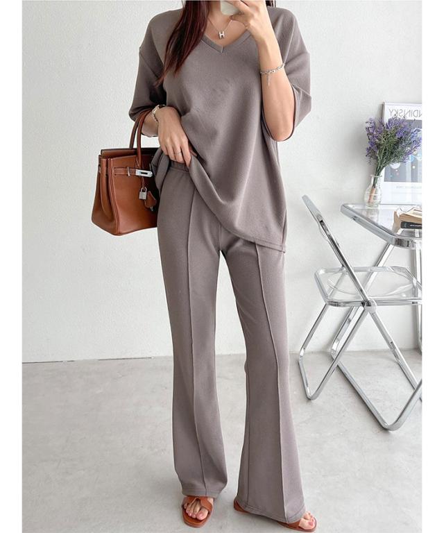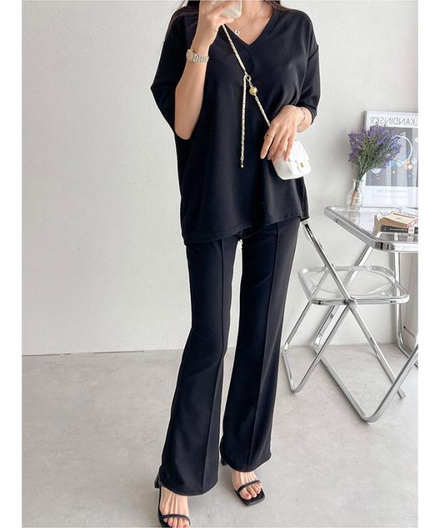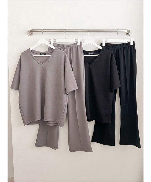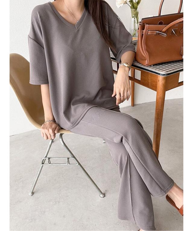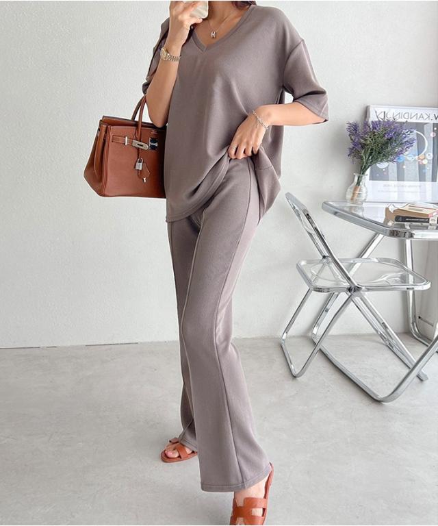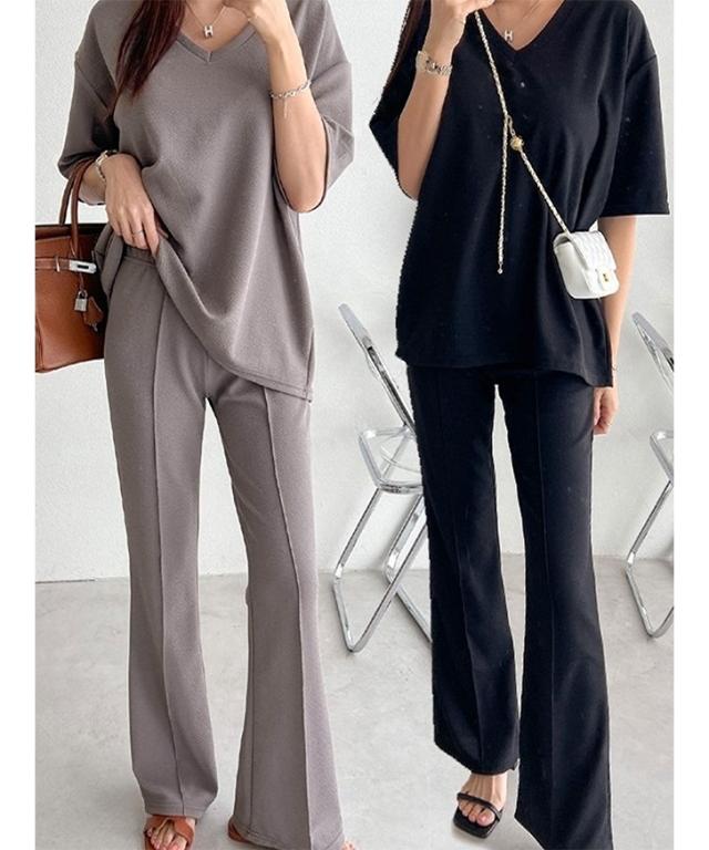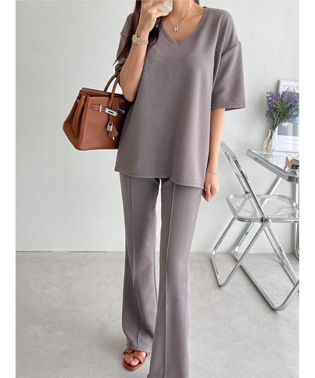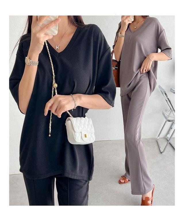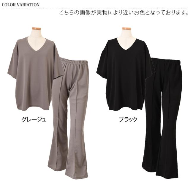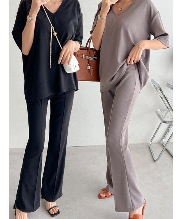 新作 エンボスVネックカットソー×センターシームフレアパンツセットアップ レディース 春 夏 半袖 上下セット カジュアル ズボン トップス ボトムス ゆったり 部屋着 ウエストゴム 韓国ファッション 楽ちん 無地