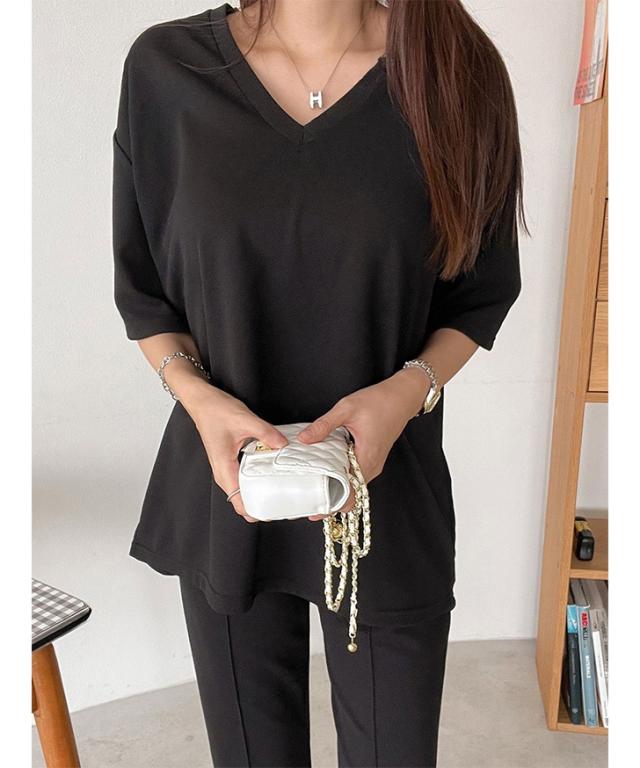 ゆったりとしたVネックカットソーと