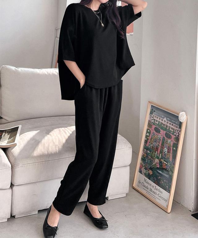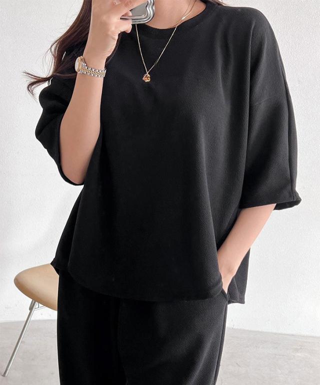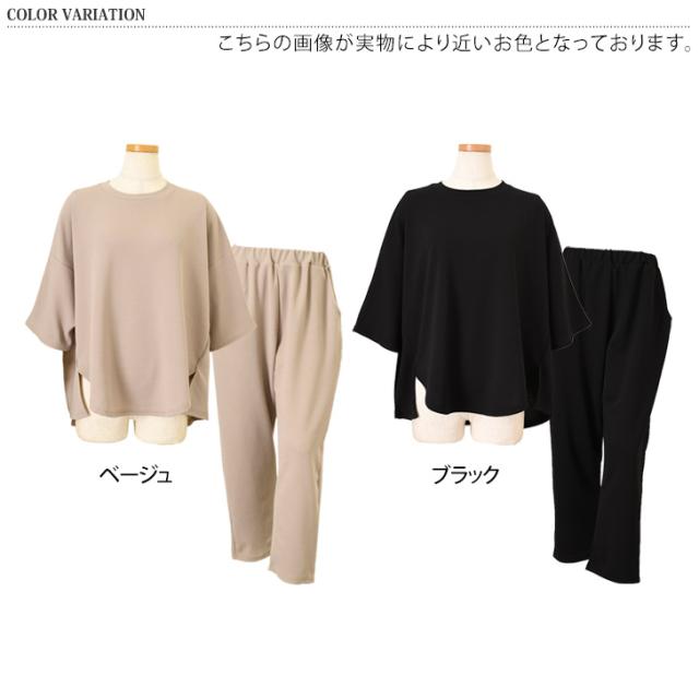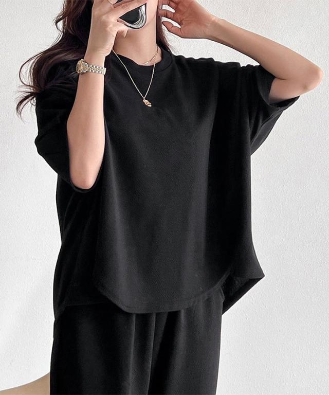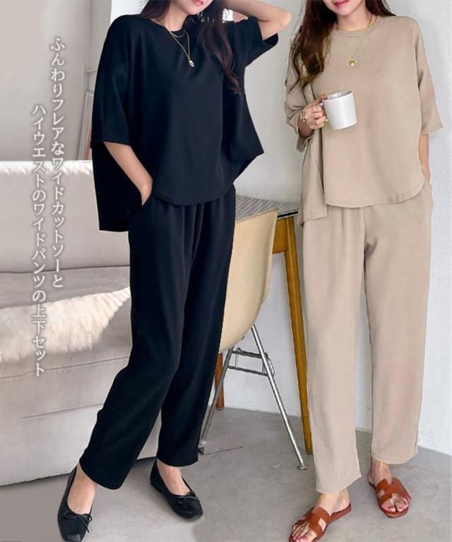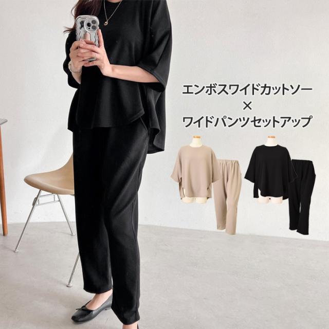 新作 エンボス切替ワイドカットソー×ポケット付きワイドパンツセットアップ レディース 春 夏 半袖 上下セット カジュアル ズボン トップス ボトムス Tシャツ ゆったり 部屋着 ウエストゴム 韓国ファッション 無地
