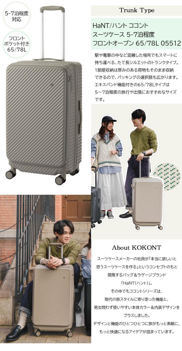 エース キャリーケース スーツケース HaNT ハント ココント 65L 78L Mサイズ 05512 フロントオープン 容量拡張 キャスターストッパー レディース 送料無料 ace.
