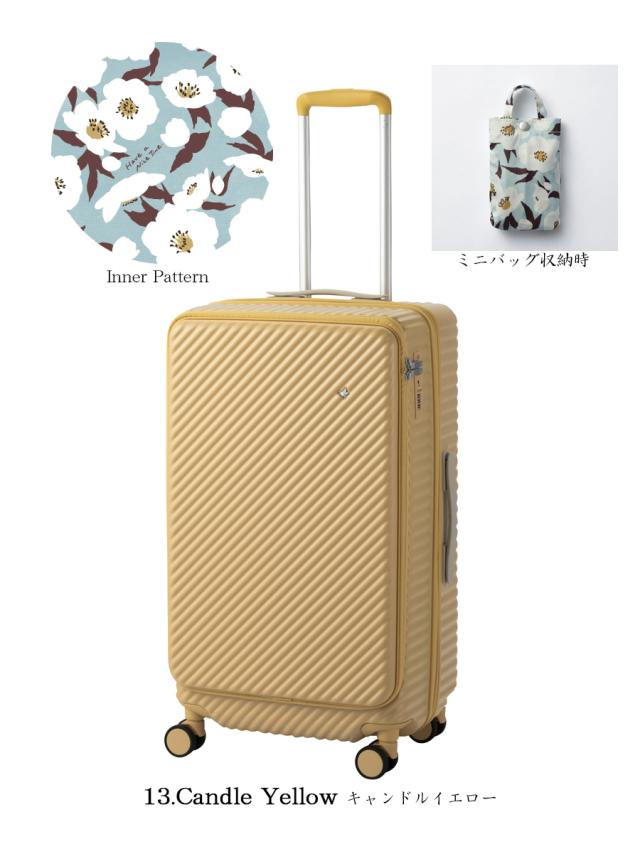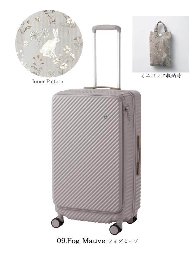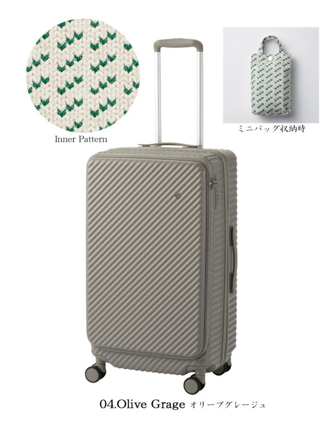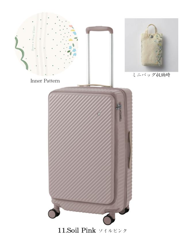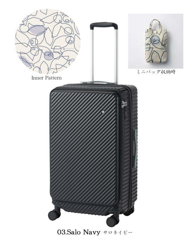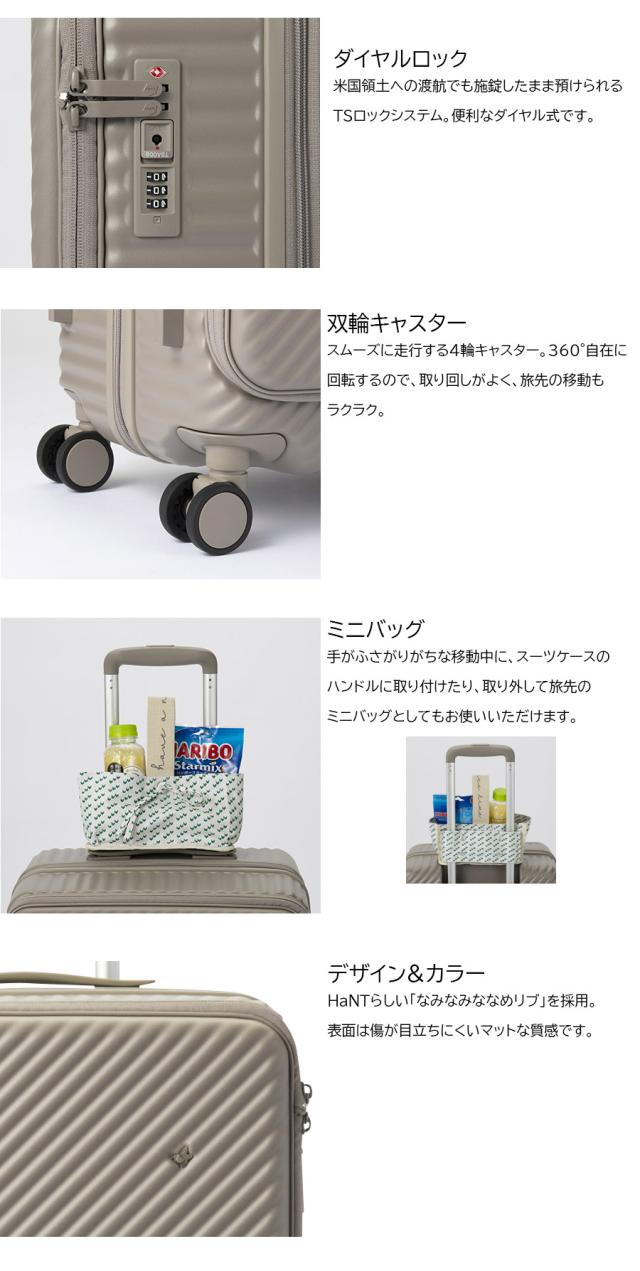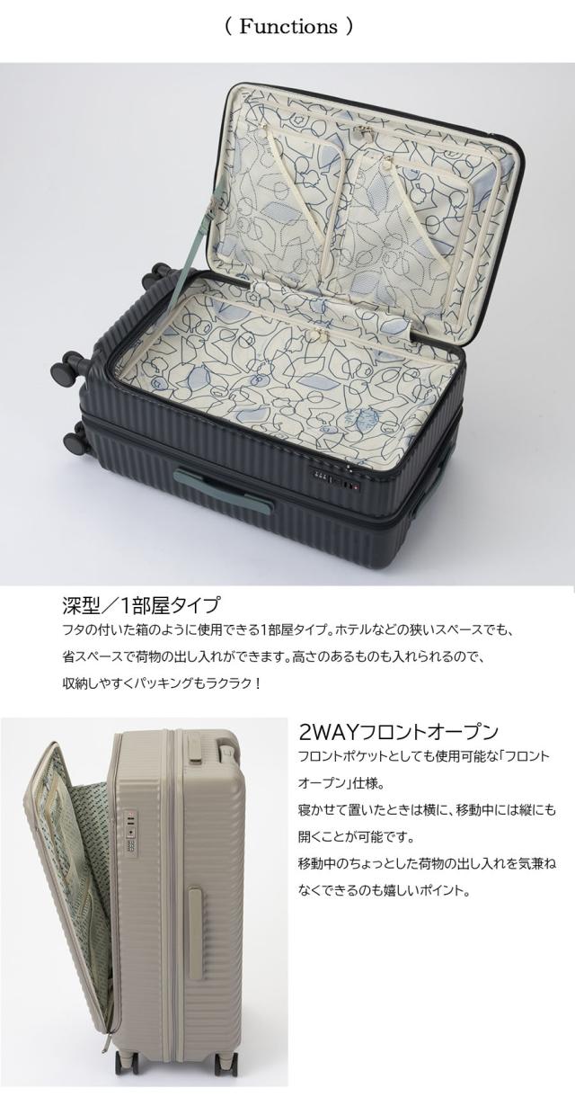機能一覧:4輪/TSダイヤルファスナーロック/キャスターストッパー/エキスパンド機能/フロントオープン/双輪キャスター/ミニバッグ付属
