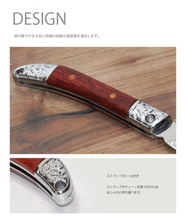 鮮やかな木目がおしゃれなポケットナイフです。