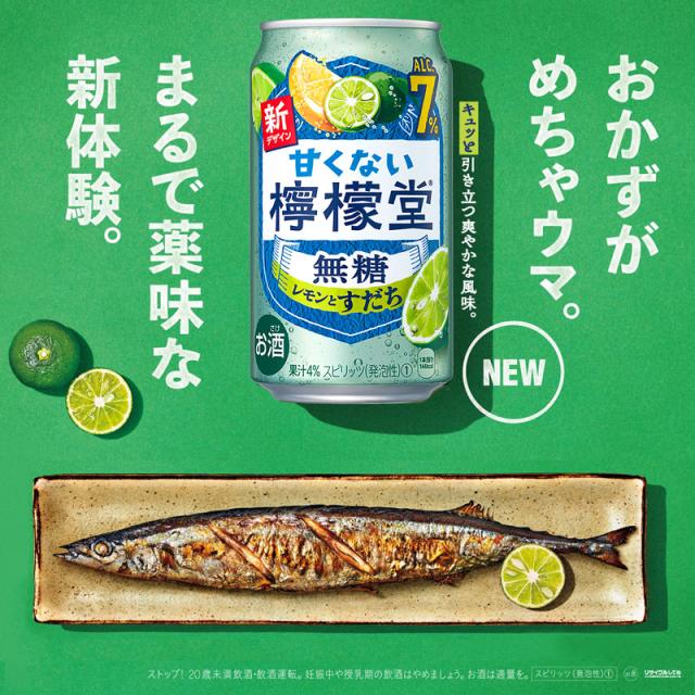 「甘くない檸檬堂 無糖レモン5%」および「甘くない檸檬堂 無糖レモンとすだち7%」もパッケージデザインが刷新されています。